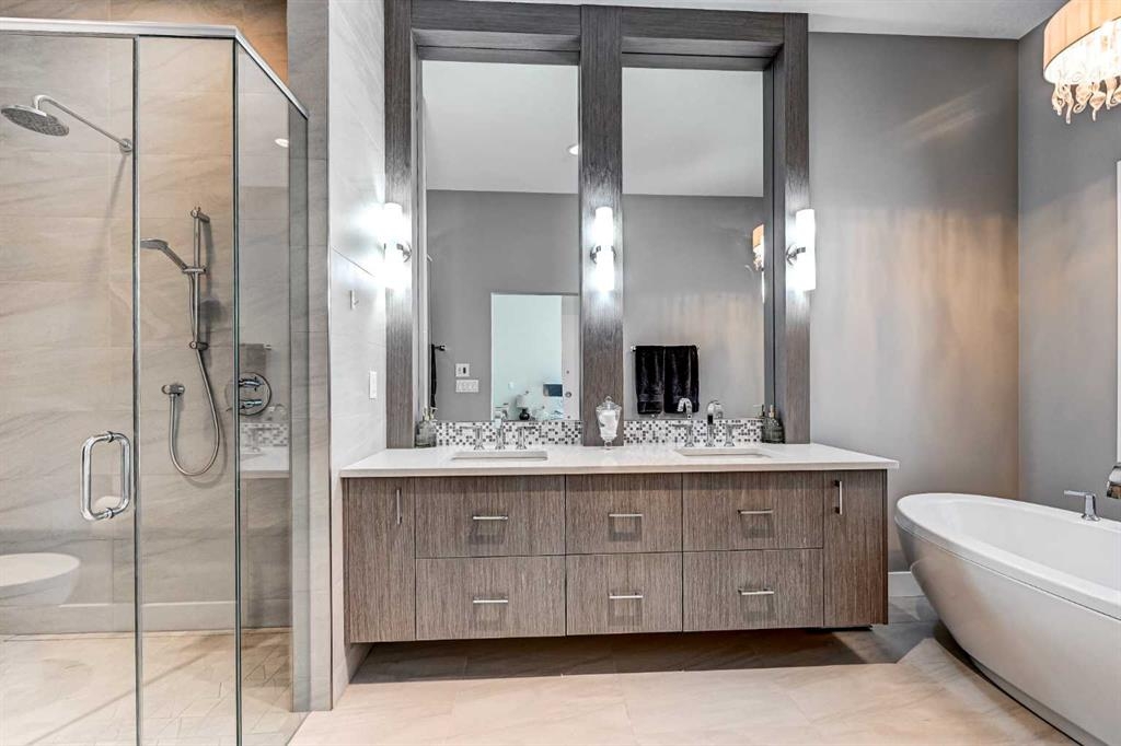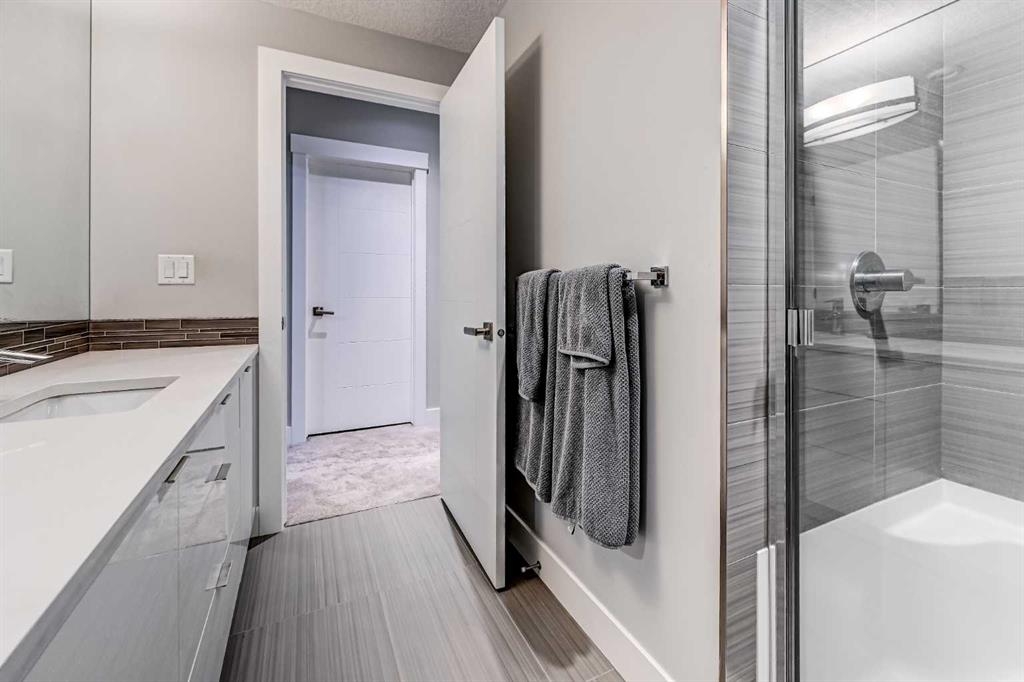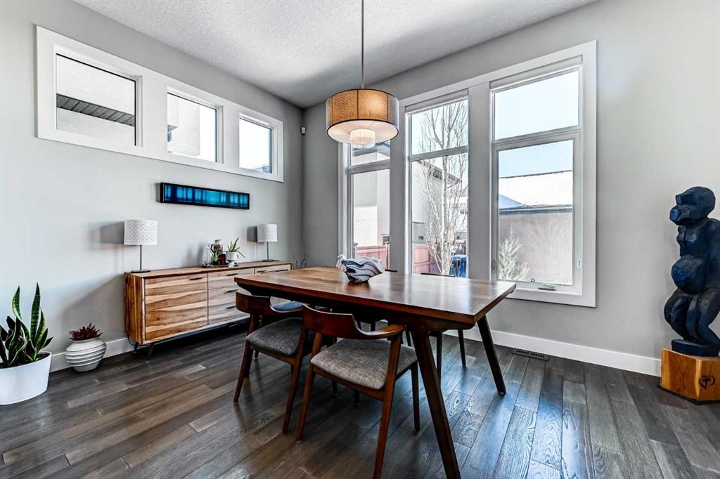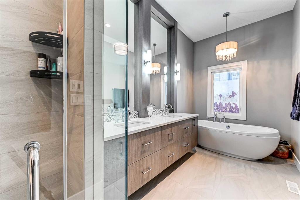 Upstairs, the primary retreat offers generous proportions and a serene ambiance, highlighted by grand east-facing windows and a custom walk-in closet complete with built-in shelving, drawers, and cabinetry. The spa-inspired ensuite features heated tile floors, a contemporary dual vanity with abundant storage, a curb-less glass shower with full-height tile, and a freestanding soaker tub — creating the ultimate space to unwind. The fully developed basement continues the home’s spacious feel with 10-foot ceilings, a custom media wall, and a full wet bar with built-in cabinetry, sink, and bar fridge — ideal for entertaining. Outside, enjoy a private fenced yard with a patio and detached garage, offering both comfort and convenience. Additional highlights include Built-in air conditioning, High-efficiency furnace with humidifier, 75-gallon hot water tank, Rough-in for radiant in-floor heating in the basement, Central vacuum system and Security system. Currie Barracks is a dynamic, award-winning master-planned community known for its pedestrian-friendly streets, urban gardens, and beautifully connected pathways. Residents enjoy nearby amenities including The Inn on Officers’ Garden — home to dining, craft beverages, a café, and local favorites — along with convenient access to Glamorgan Shopping Centre (Glamorgan bakery), Marda Loop, and Mount Royal University. Downtown Calgary is just minutes away, making this location as practical as it is prestigious. With nearby parks, including Currie Bark Park and Airplane Park, plus proximity to top schools, this exceptional home offers an unmatched lifestyle in one of Calgary’s most sought-after communities.